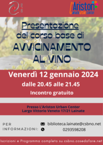 Venerdì 12 gennaio, alle ore 20.45, vi aspettiamo nell’Auditorium Ariston Lainate Urban Center per la Presentazione corso base avvicinamento al vino.